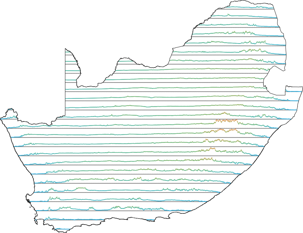 Today I saw a Reddit post where someone had hand-traced some elevation profiles across South Africa. I thought it looked rather similar to the iconic Joy Division album cover that give Joy Plots their name, so I decided to give making a nicer map (to me) a go.